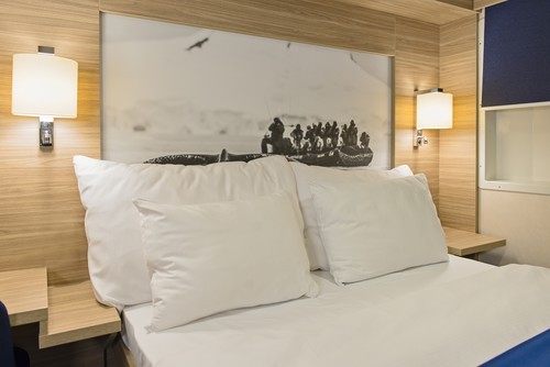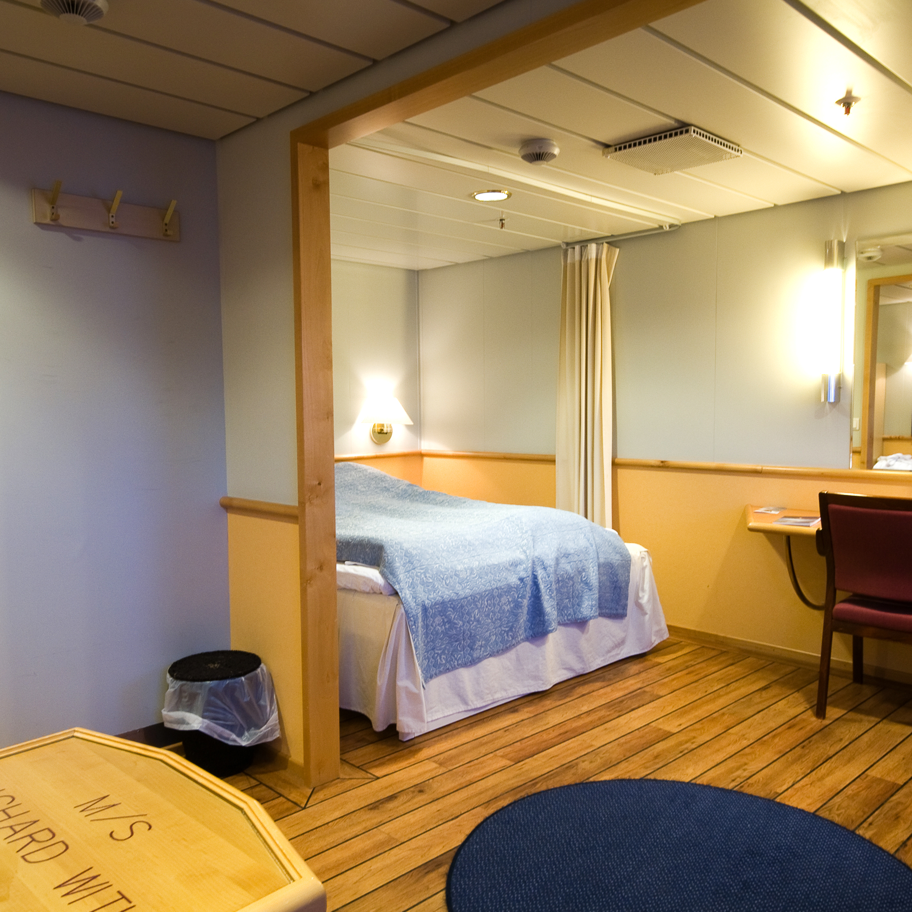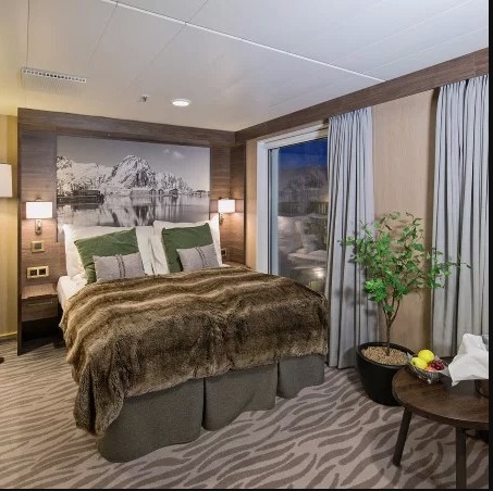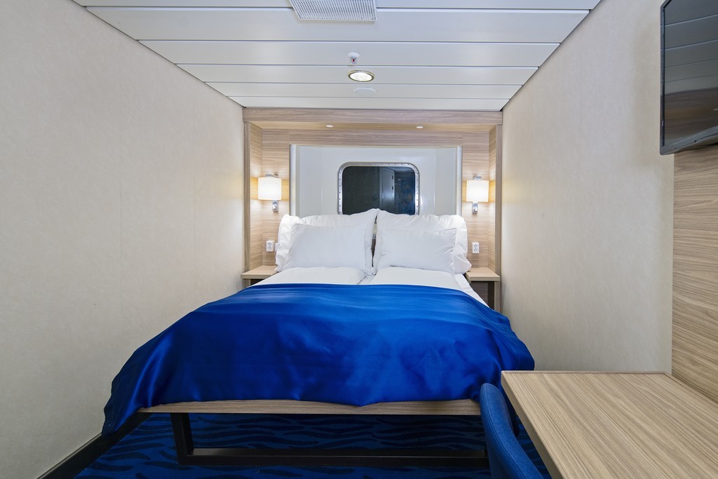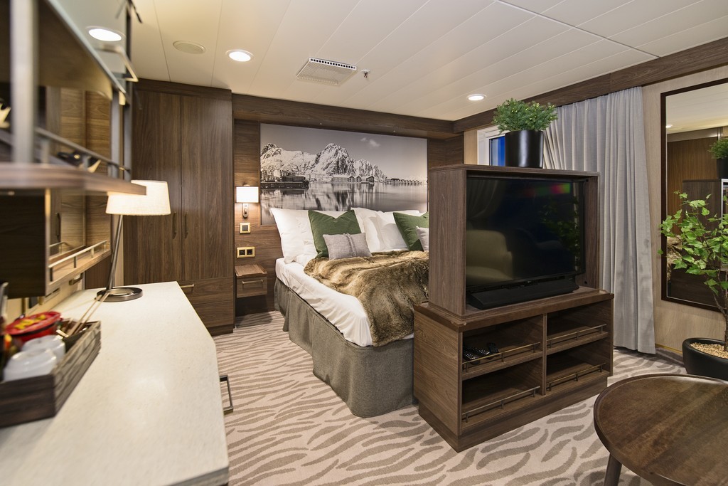 Refurbished arctic superior cabin for 2 people on upper decks. The cabin comes with a double bed, full view, chair, desk and TV.