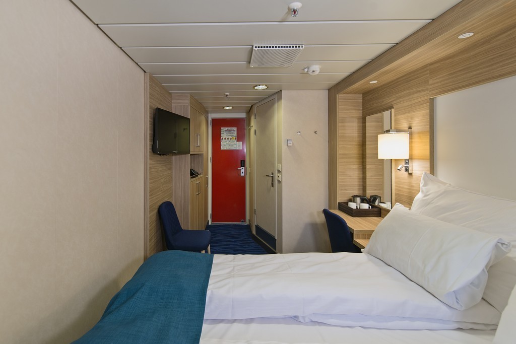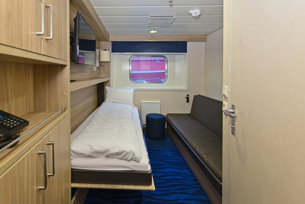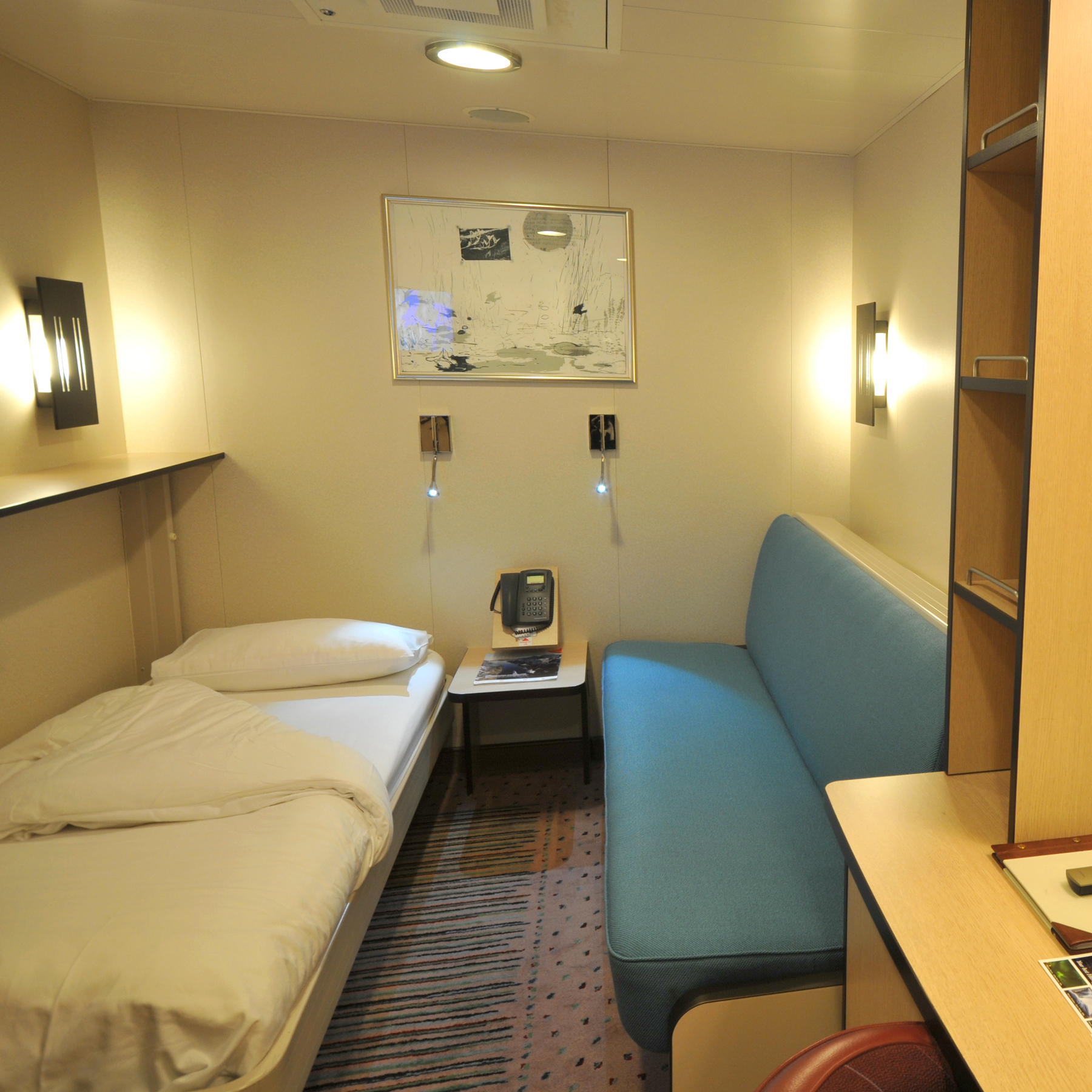 These standard inside cabins for up to two people on the upper and lower decks have separate beds, one of which doubles as a sofa, and a TV. None of the cabins have windows.