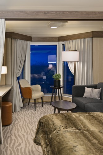 Refurbished expedition suite with bay windows on upper deck. The suites have double beds and extra sofa beds, TV and minibar.