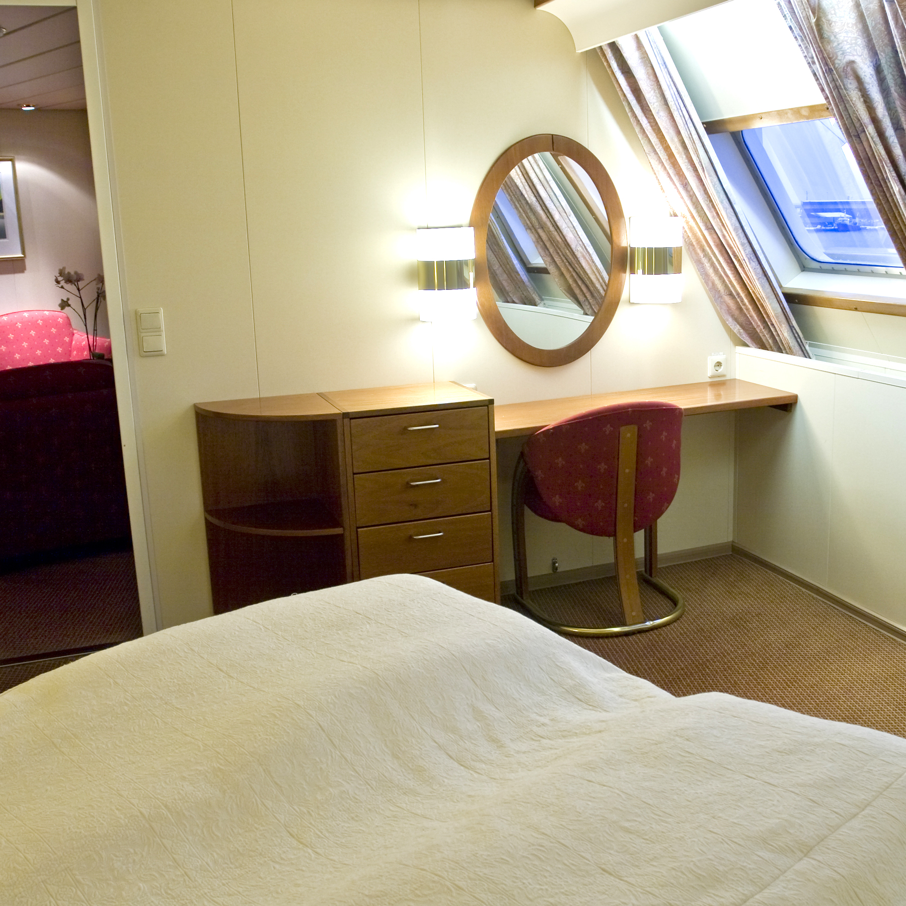 These comfortable suites on the upper dek have double beds, and most have sofa groups as well. The suites also have TV, internet access, minibar, and a great view. The suites are double the size of other cabins.
