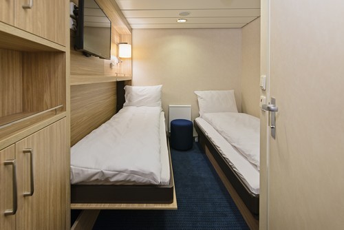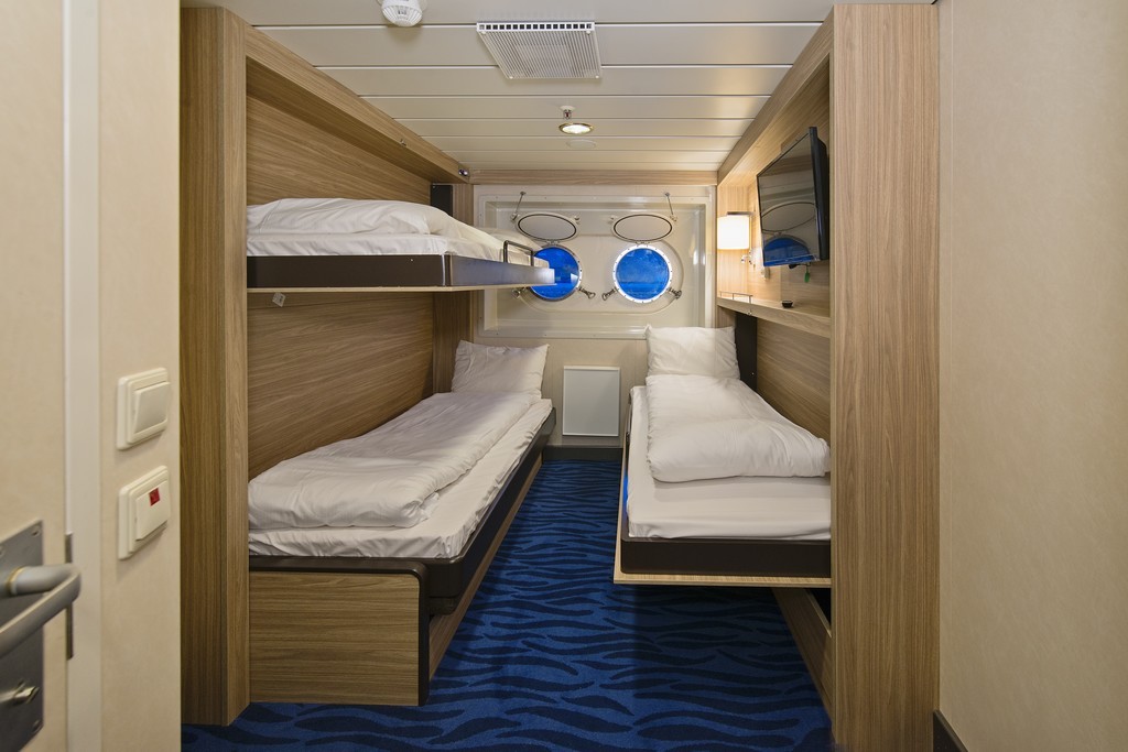 These comfortable outside cabins for up to two people on the lower deck have separate beds, one of which converts into a sofa. The cabins have a TV, chair, and portholes or windows, some with limited or no view. Most of L2 cabins have portholes. The pictu