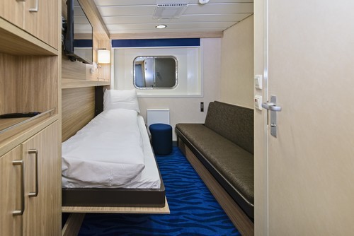 2- or 3-bed cabin with a bed and sofa bed. Categories L & J have limited or no view. Categories J & U have a 3-bed cabin with a bunk bed.